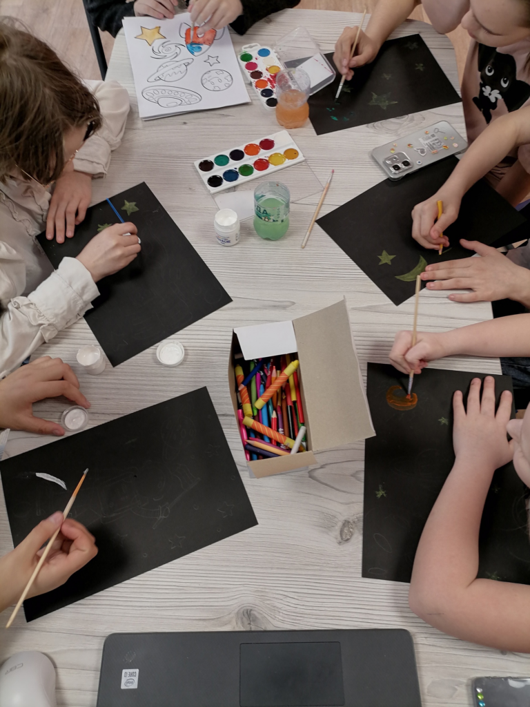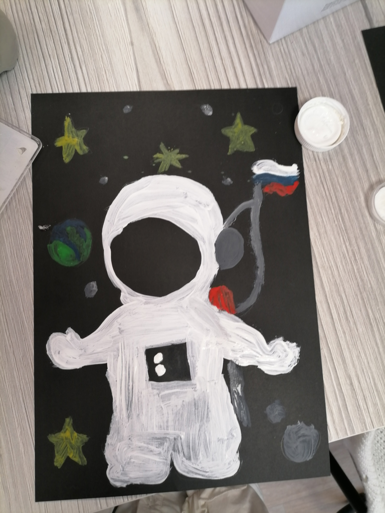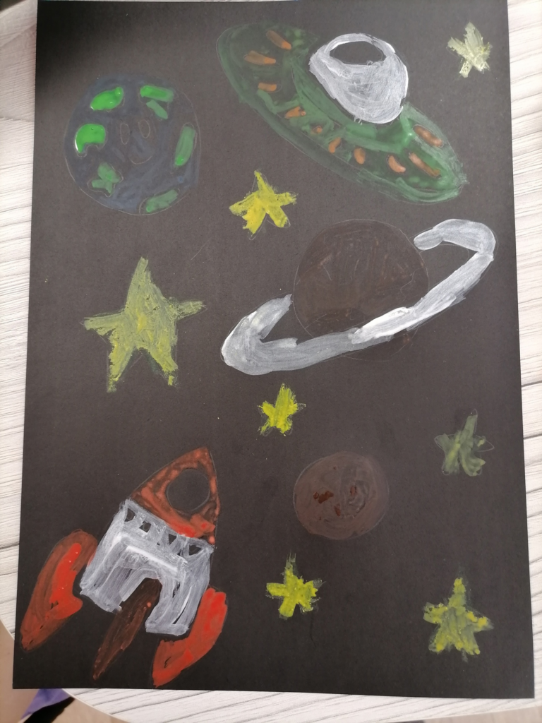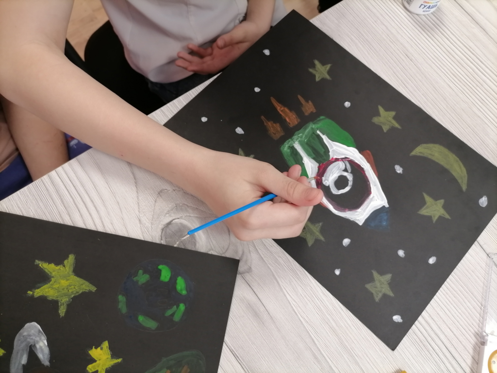 День космонавтики знаменательный праздник, а значит, самое время подумать о том, как скрасить досуг детей и при этом в увлекательной форме познакомить их с этим событием. Сегодня мы с ребятами вооружились красками и мелками, приступили к рисованию космоса на черном полотне. Процесс рисования сопровождался интересным рассказом об истории космонавтики, о первых полетах и о том, насколько важно изучать такой загадочный и бесконечный космос.