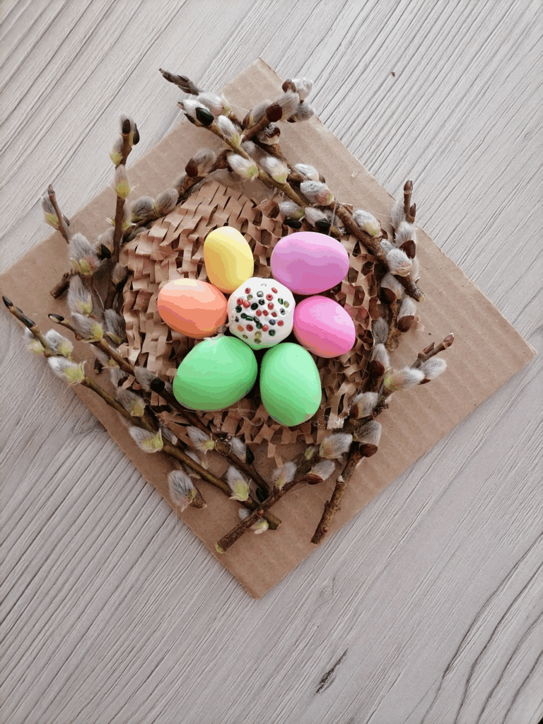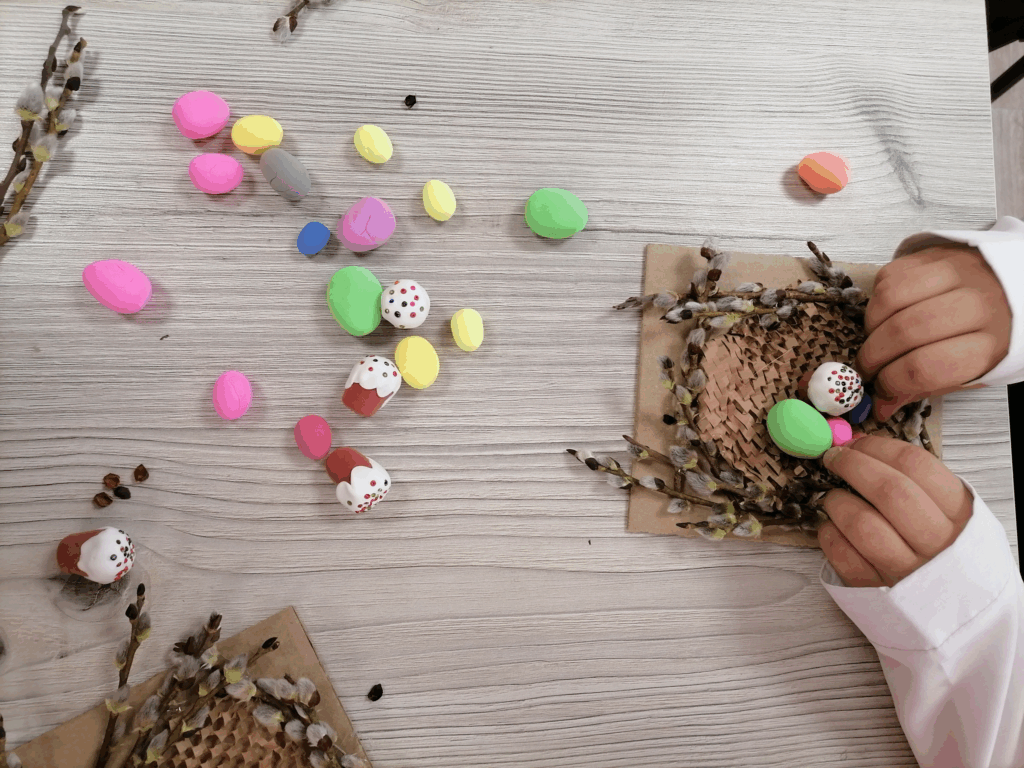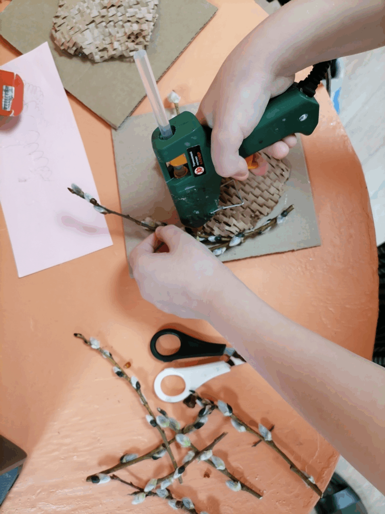 Еще совсем немного, и наступит ещё один православный праздник, который особенно любят дети, да и не только. Речь идет о Пасхе, а именно о том, какие поделки можно будет выполнить вместе с детьми к этому дню. Сегодня мы с ребятами выполняли пасхальную композицию из веточек вербы и креативного украшения. Объёмные работы с элементами пасхального декора: яички и куличики мы слепили их воздушного пластилина, добавили природный и бросовый материал и вышло очень мило и красиво.