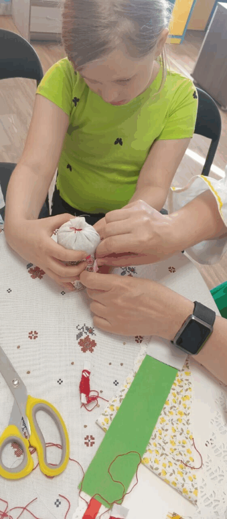 В рамках патриотического воспитания и сохранения русских традиций социальный педагог отделения социальной помощи семье и детям Л.И. Хорина внедрила в свою работу практику: » Народная кукла — хранитель семейных традиций». Частыми гостями Людмилы Ивановны бывают многодетные семьи, которые за кружечкой горячего чая ведут беседы о традициях, обычаях, чтобы передать их молодому поколения. На этой встрече ребята с мамой своими руками делали «Куклу-мотанку», которая является продавим сакральным оберегом.