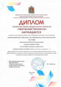 Ежегодно Министерство социальной политики Красноярского края проводит Краевой фестиваль самодеятельного творчества «Творческие горизонты». Фестиваль проводится среди граждан старшего поколения, посещающих Комплексные центры социального обслуживания населения Красноярского края, с июня по август 2025 года.